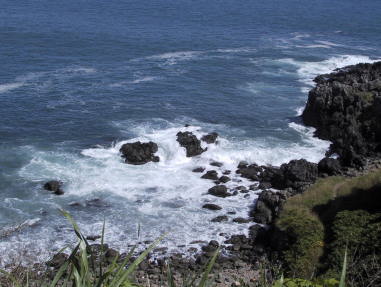 | 時化の立待岬。波で海が白く濁る。 | 左と同じ場所。なにごともなかったような穏やか な海。 この日、反対側の穴澗は波が高かった。 |