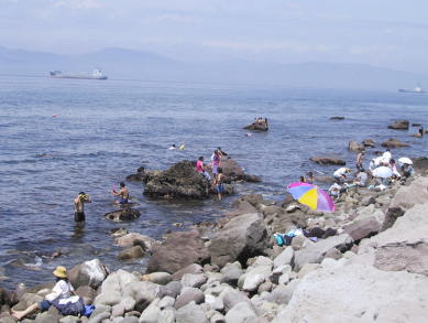 | 7月30日 日曜日の入船海水浴場のの賑わい。 他に、周りを網で囲ったネット式海水浴場が 湯の川にある。 |