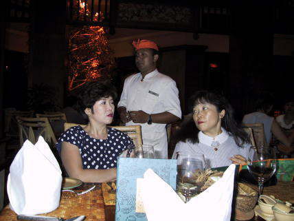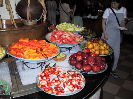 | 南国の果物は、色鮮やか。私の好きなマンゴーはなかった。 レストランの食事代金は、日本の5分の一程度。 でもインフレで、ビールが2万ルピア(300円)。計算が大変だ。 |