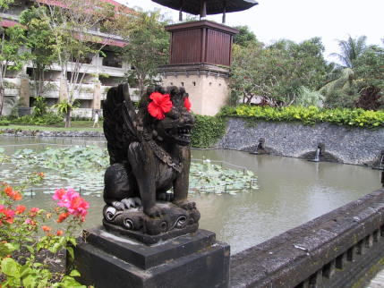 | 石像の耳には、生花のハイビスカス。毎朝取り替えていた。 ゲストと同数の従業員がサービスする。 |