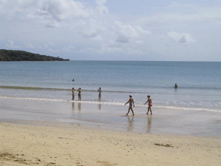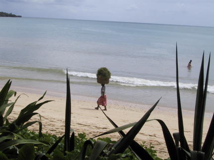 向かい側の丘には、コテージ形式のホテルが広がる。 プライベートビーチではないが、人影はまばらだ。 時折、竹篭を頭に載せた現地人が通る。 中には、刈り取った草が入っている。 |