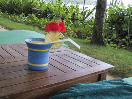 | このようなプールが三つもある。 | マンゴーのフレッシュジュース。赤い花をあしらって ムード満点。 |