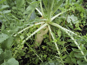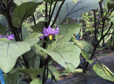 | 私の畑の大根はとても辛い。土のせいだろうか。 | 茄子の花。今年は病虫害にもかからず、すくすく 育った。 |