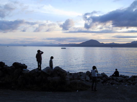 入船の浜辺である。3年前のある日、夕日をバックに沖縄民謡を歌う